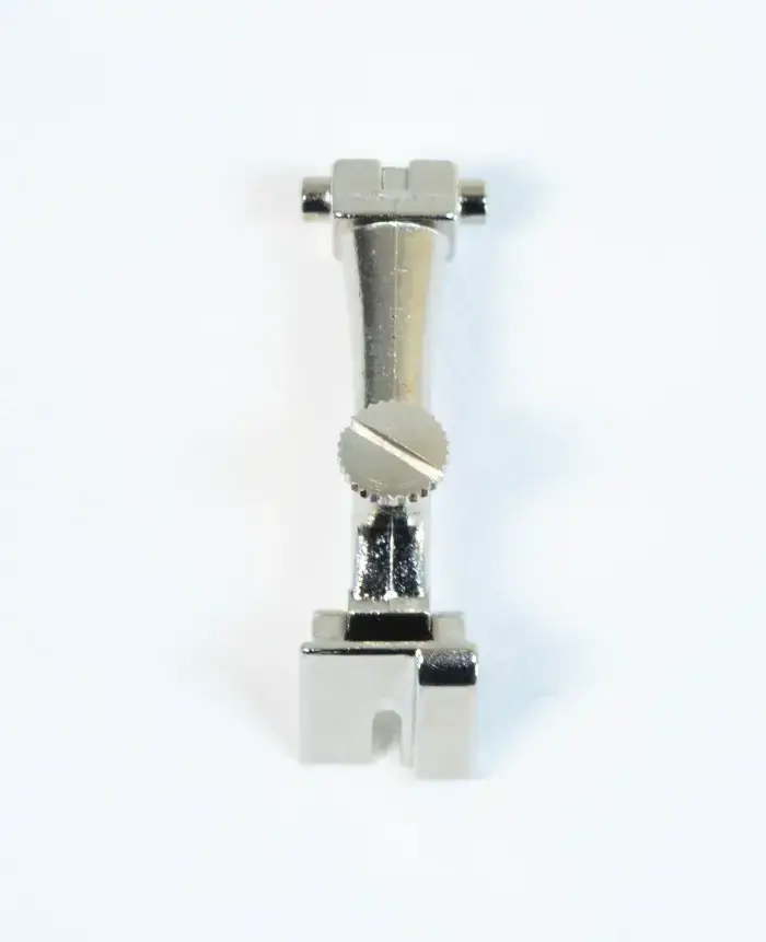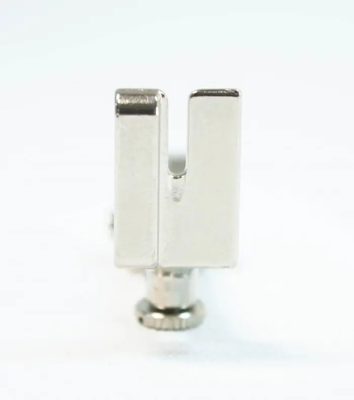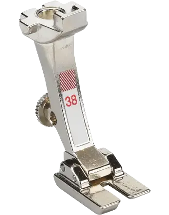 Piping Foot #38, also known as the “uneven foot,” features two halves of differing thicknesses, making it perfect for creating narrow-to-medium piping and handling unevenly thick fabric layers. The design of this foot allows the higher right side to glide smoothly over fabric as you sew. Besides piping, it is also suitable for attaching thick tape, ribbon, cords, or hook-and-loop tape. For best results when sewing on tape, position the tape under the right side of the foot so it aligns flush with the edge of the thicker left side, allowing the needle to easily catch the edge of the tape.