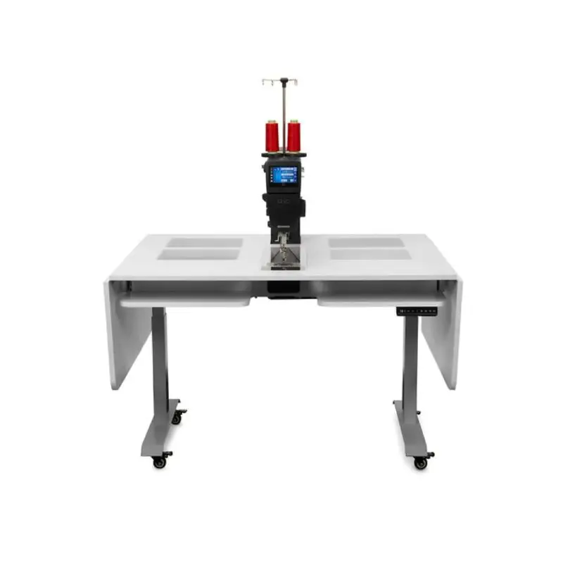 The Bernina Lift Table offers stepless, electrical height adjustment for added convenience. It also features integrated storage solutions for items like threads, bobbins, scissors, and more. Additionally, this table can be easily expanded on one or both sides, providing you with flexibility and extra workspace as needed.