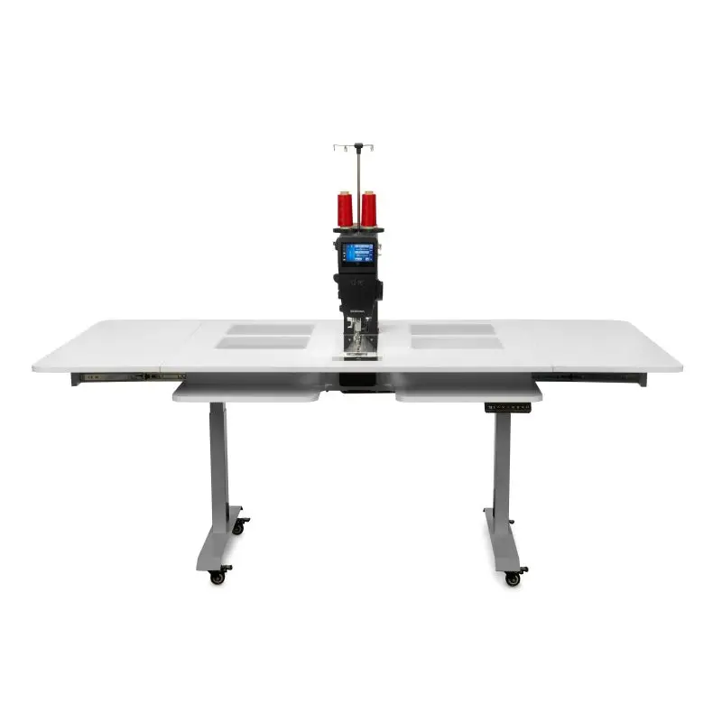 The Bernina Lift Table offers stepless, electrical height adjustment for added convenience. It also features integrated storage solutions for items like threads, bobbins, scissors, and more. Additionally, this table can be easily expanded on one or both sides, providing you with flexibility and extra workspace as needed.