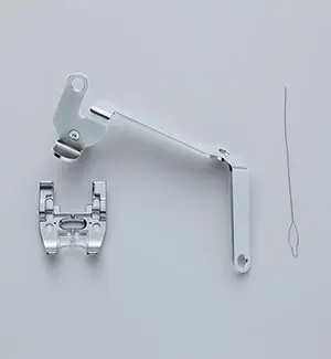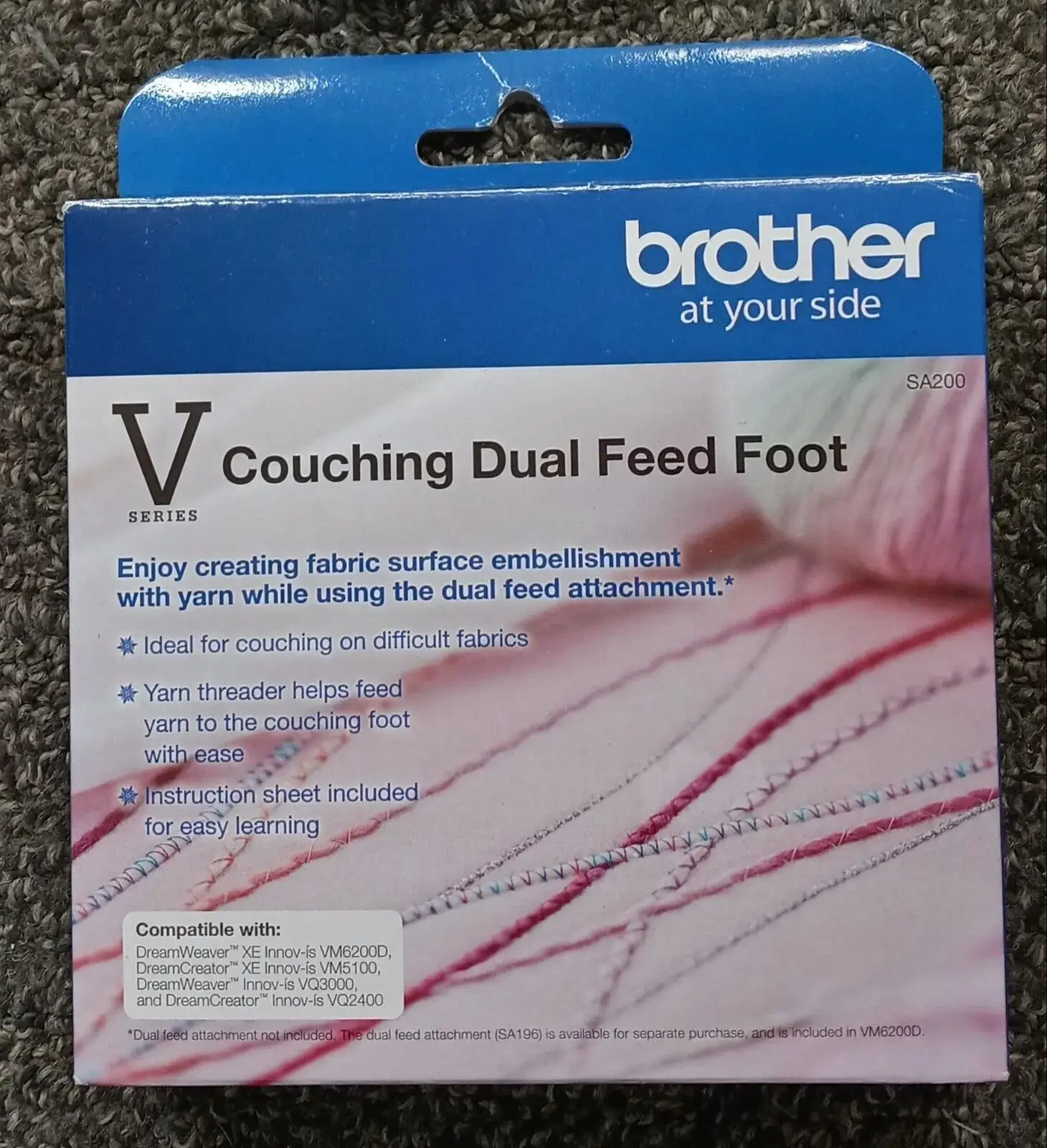 The Brother Couching Dual Feed Foot for V-series Machines makes fabric surface embellishment a breeze using yarn and decorative cords. Designed for use with the MuVit Dual Feed Attachment (sold separately), this foot is perfect for couching on challenging fabrics. It comes with a yarn threader to help easily feed yarn to the foot and yarn guides that make the technique quick and simple. The set includes the couching dual feed foot, yarn guide, yarn threader, and an instruction sheet, making it easy to start creating beautiful, textured designs. The MuVit Dual Feed Attachment (SA196) is available for separate purchase and is included with the VM6200D machine.