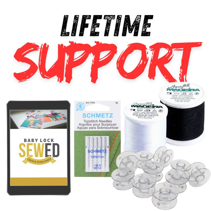 Get more value with your Baby Lock sewing machine purchase with this free bonus bundle designed to help you get started with confidence. This special offer includes Baby Lock’s 60 Day Love of Knowledge program for helpful training and guidance as you learn your machine, 1 pack of needles for a fresh start, 10 extra bobbins to keep your favorite thread colors ready, black thread, white thread, and virtual lifetime support for ongoing expert help whenever you need it. It is a practical bundle that adds convenience, support, and lasting value to your Baby Lock sewing machine purchase.