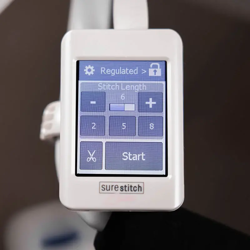 The Grace Company SureStitch Elite Stitch Regulator takes your home machine quilting to the next level with its sleek design and intuitive, user-friendly touchscreen interface. Building on the original SureStitch, the Elite model offers new features for perfectly consistent stitches, making it easier than ever to achieve professional results. The SureStitch Elite includes customizable stitch length presets, an over-speed buzzer, minimum speed adjustment, a ruler function, a calculator, and customizable color themes. Additionally, it features an edge warning alarm and a one-touch manual setting for enhanced creativity and control, offering a wide range of options to tailor your quilting experience.