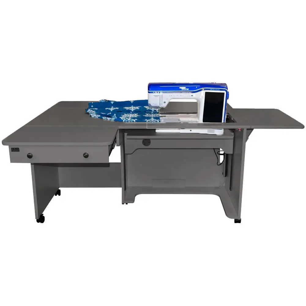 The enhanced Horn Model 8280 Quilter’s Dream XL cabinet is designed to meet the needs of modern quilters with a spacious 31″ x 15-1/2″ opening that accommodates larger quilting machines. It features a generous drawer extension for extra space, a 14″ drop leaf for handling large projects, and a right-side swing-up extension for storing notions and tools. This thoughtful design offers ample workspace, keeping your area organized and providing everything you need for precision and ease during your quilting projects.