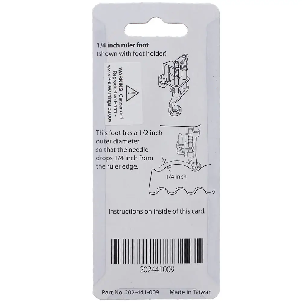The Janome ¼” Ruler Foot is the ideal foot for sewists who work with rulers. Designed specifically for use with Janome quilting rulers, the ¼” cup height allows the foot to glide smoothly alongside the ruler, preventing it from sliding over or under. This foot ensures that the needle drops exactly 1/4 inch away from the ruler, making it perfect for creating precise quilting lines. It’s an essential tool for achieving accurate and consistent ruler work in your quilting projects.