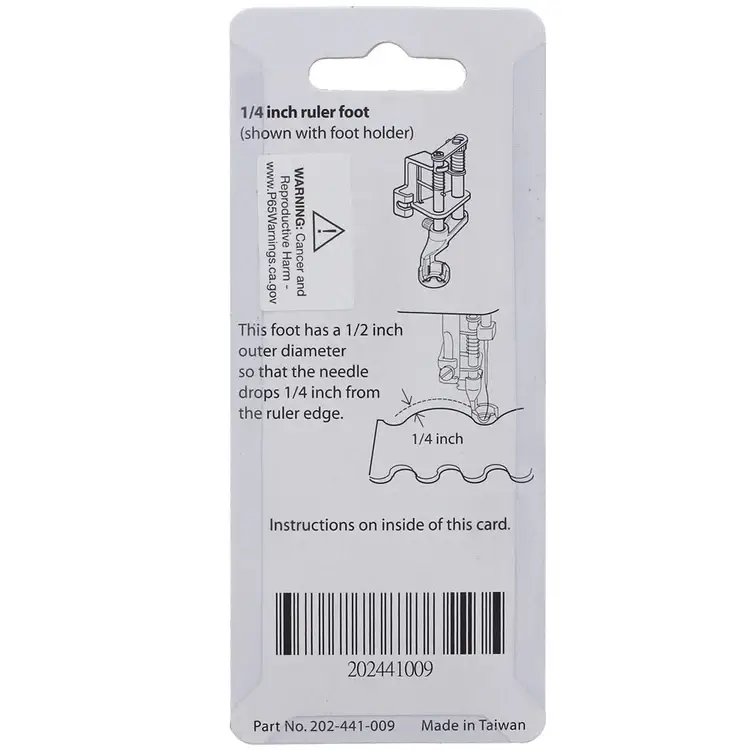 The Janome ¼” Ruler Foot HS is a must-have for quilters who love using rulers. Designed for precision, this foot features a high ¼” cup that glides smoothly along the edge of your quilting ruler without slipping underneath or over the top. It keeps your stitches accurate and consistent by positioning the needle exactly ¼” from the ruler, making it easy to create clean, professional quilting lines. Perfect for ruler-guided free-motion quilting on compatible Janome machines.
