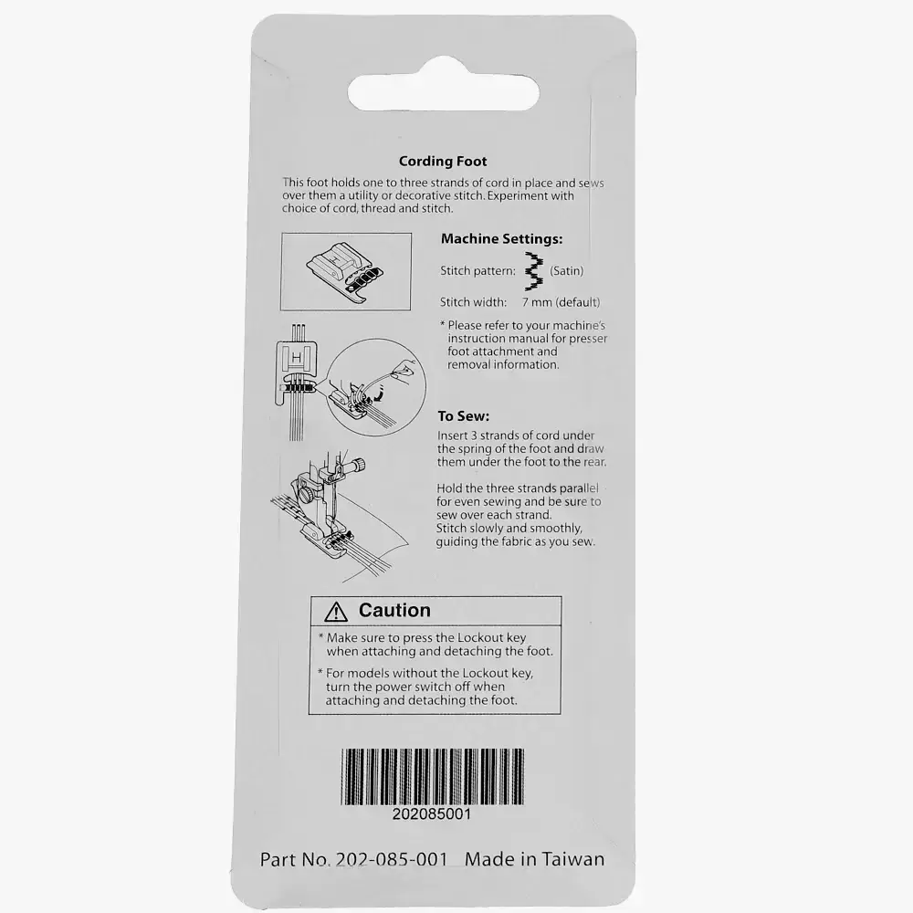 - Presser Foot Type: Cording Foot