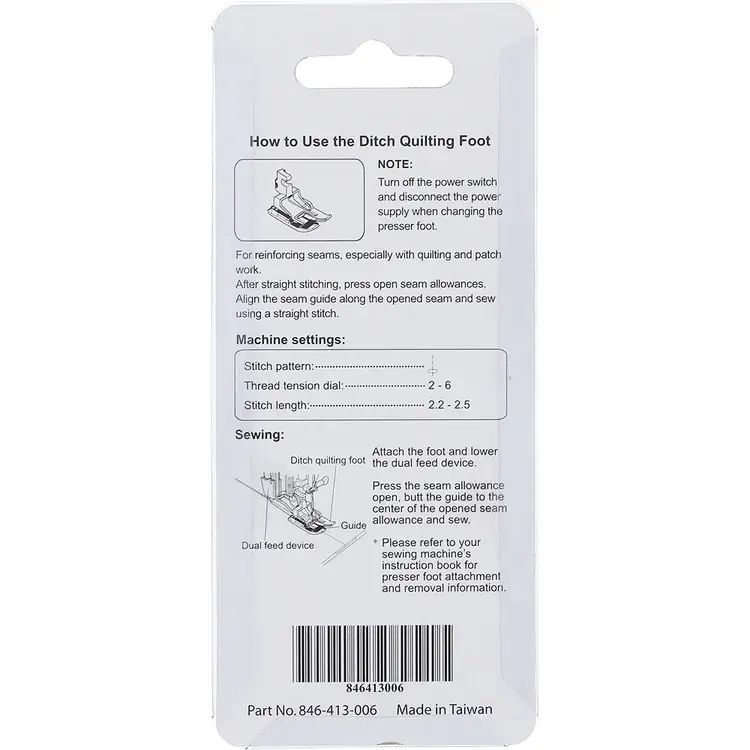 - Presser Foot Type: Ditch Quilting Foot