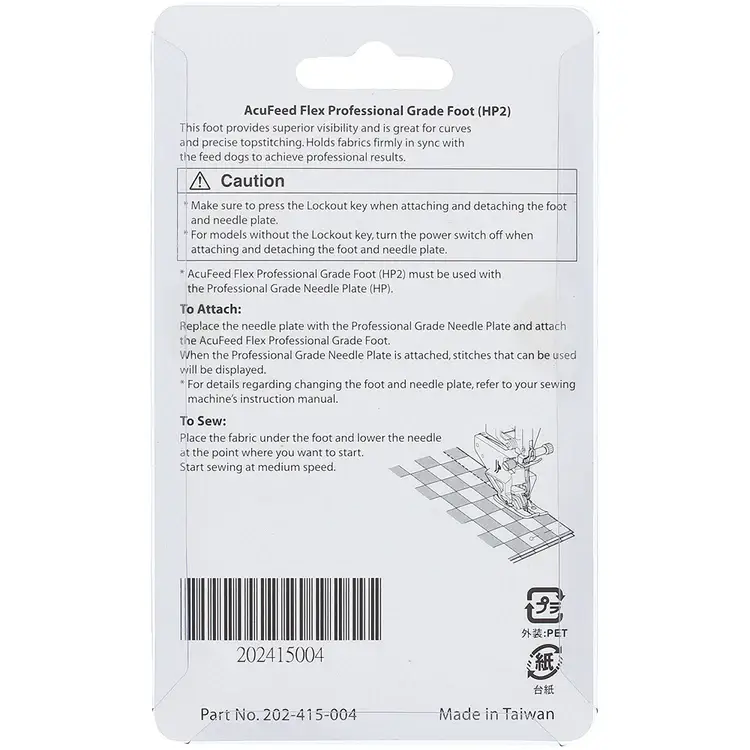 The Janome AcuFeed Flex Professional Grade Foot HP2 offers superior visibility, making it ideal for sewing curves and precise topstitching. Its narrow foot width and the slit at the front of the foot provide excellent visibility, ensuring professional results. The foot works in perfect sync with the feed dogs to hold fabrics firmly, delivering smooth feeding, especially when quilting or sewing challenging materials like leather or vinyl. When you match the fabric edge with the foot’s edge, it ensures a perfect 1/4″ seam allowance. This foot is designed to be used with the Professional Grade Needle Plate (HP) for optimal performance.