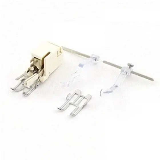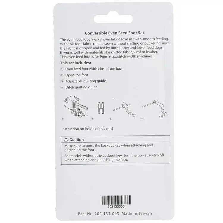 The Janome Convertible Even Feed Foot Set (9mm w/o AcuFeed) is a must-have for quilters, offering a range of convenient features to help achieve beautiful quilting results. This set includes an Even Feed Foot with Closed Toe, a Convertible Open Toe Foot for better visibility, a Ditch Quilting Guide, and an Adjustable Quilting Guide. The innovative construction of these feet makes it easier than ever to set up for various quilting tasks, providing smooth, even fabric feeding and precision in your quilting projects.