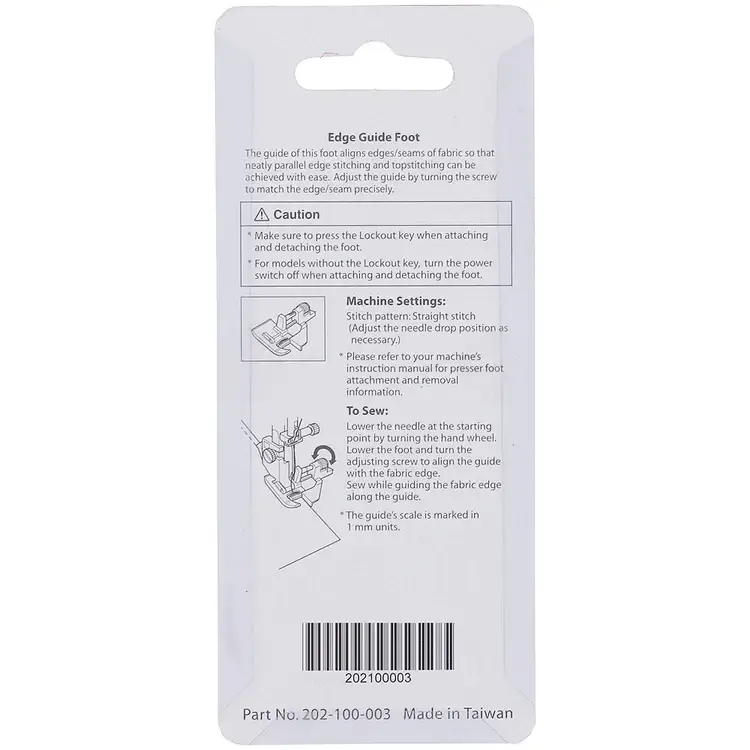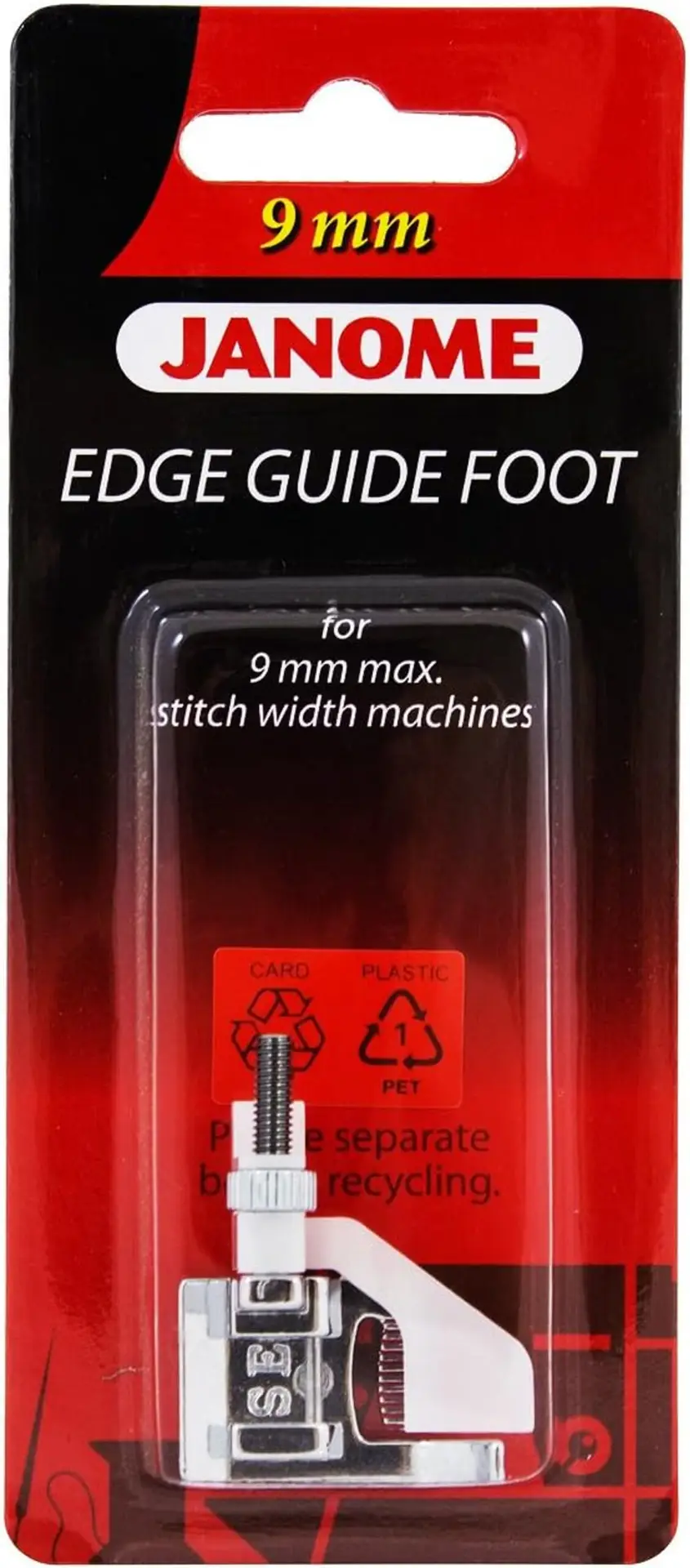 The Janome Edge Guide Foot 9mm is designed to help you stitch perfectly along the edges of fabrics. With its unique features, it ensures precise stitching every time, making it ideal for creating decorative trims, hems, and other edge finishes in perfectly straight lines. This foot is perfect for achieving clean, professional-looking results on a variety of projects.