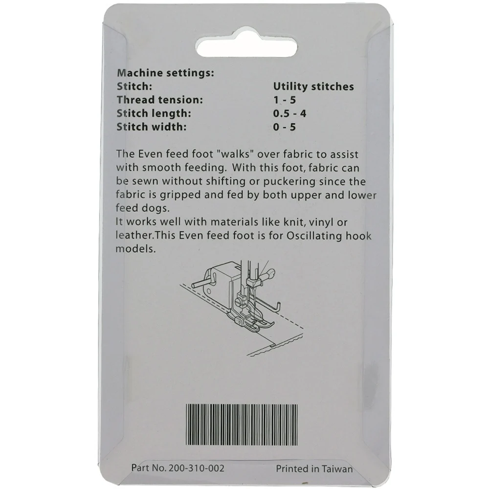 - Presser Foot Type: Walking Foot (Even Feed) Foot