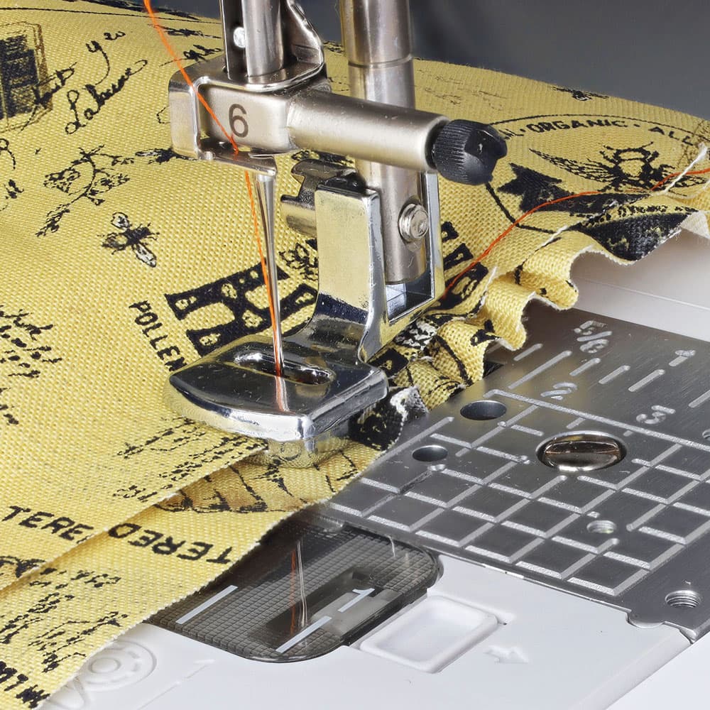 The Janome Gathering Foot (Front Loading) is perfect for creating soft, even gathers in lightweight fabrics. Its raised underside and thick front bar help gently gather fabric while attaching it to a flat layer at the same time—great for ruffles, dresses, and home décor. For fuller gathers, consider using a ruffler attachment.