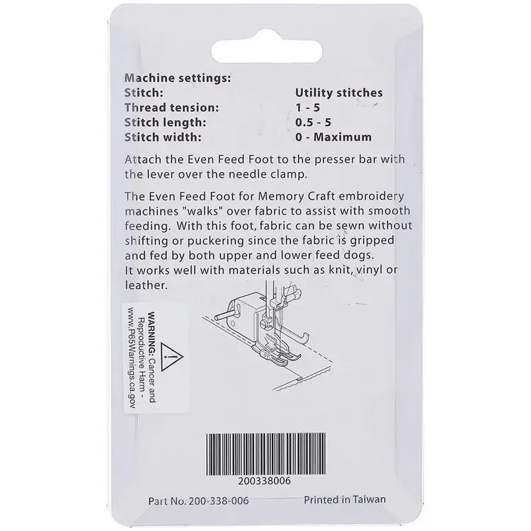 - Presser Foot Type: Walking Foot (Even Feed) Foot