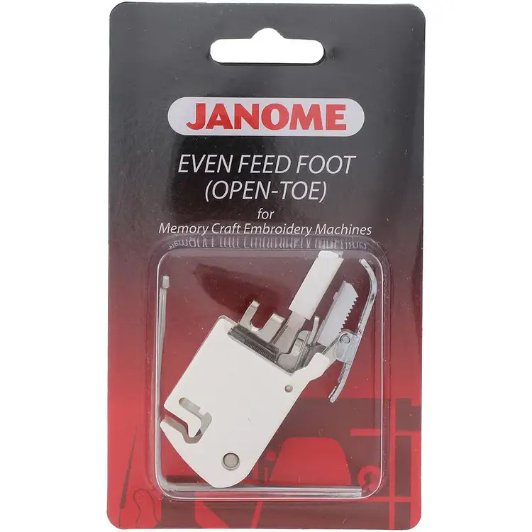 The Janome Open Toe Even Feed Foot with Quilting Guide (7mm High Shank) is perfect for smooth, even stitching across multiple fabric layers. Also known as a walking foot, it has built-in feed dogs to prevent shifting and puckering, especially helpful for quilting and topstitching. The open toe design offers better visibility, while the included quilting guide helps you keep consistent spacing between rows for professional-looking results.
