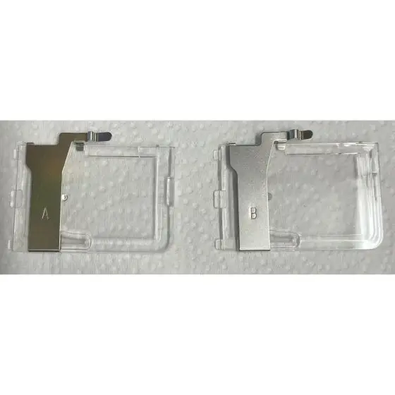 The Janome Pintucking Cord Guides (for Easy Set Bobbins) are designed to help you easily create corded pintucks as you sew. The cord guides replace the clear plastic bobbin cover and feed perle cotton or other cords through the machine. The set includes two guides: one for cords up to 1.5mm in diameter and another for cords ranging from 1.5mm to 2.5mm, making it versatile for different cord sizes. This tool simplifies the process of adding beautiful corded details to your projects.