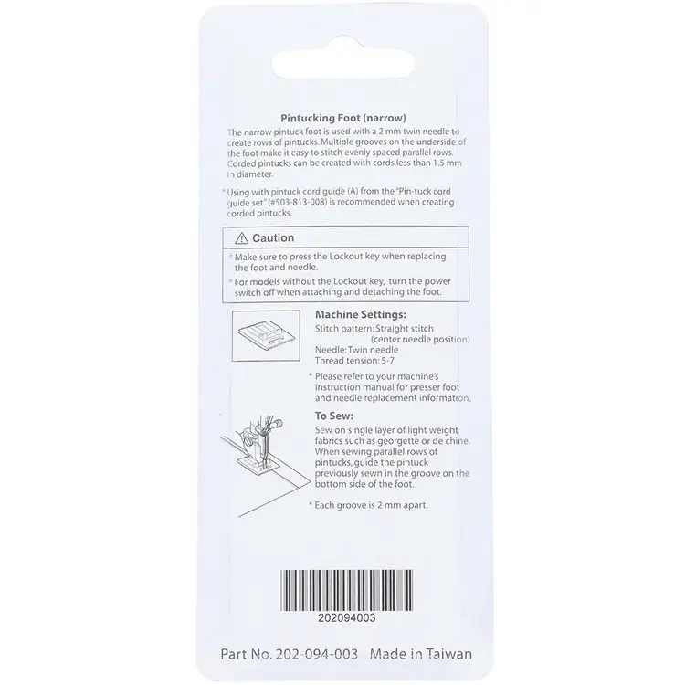 - Presser Foot Type: Pintuck Foot