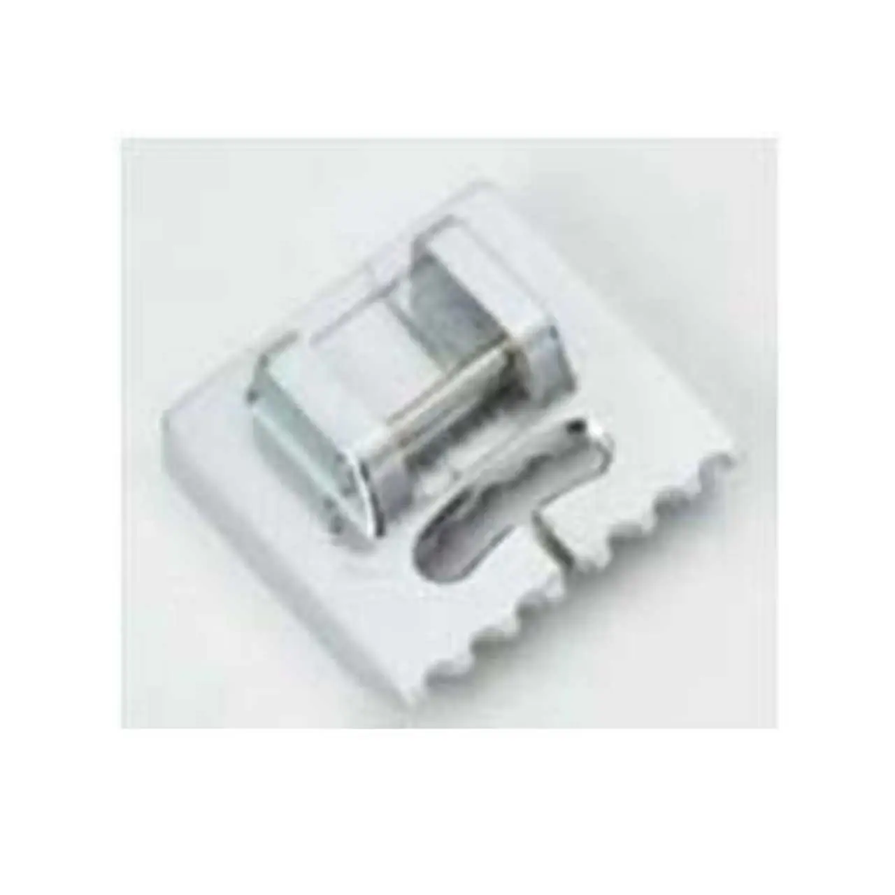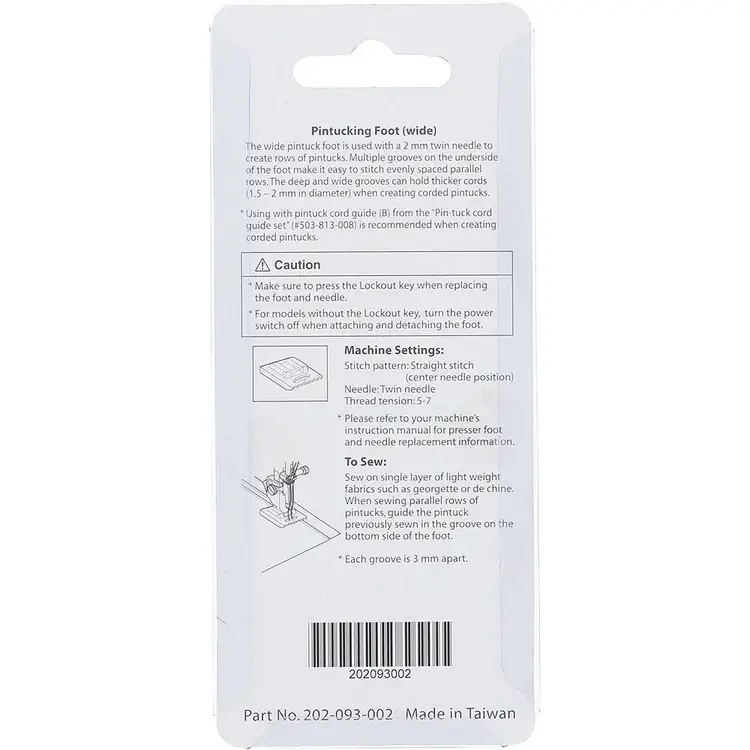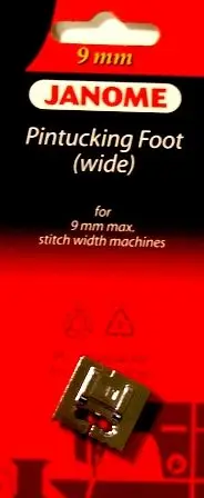 The Janome Pintucking Foot 9mm Wide is designed to work with a 2mm twin needle to create multiple rows of pintucks. The grooves on the underside of the foot help guide the fabric, making it easy to stitch several rows that are parallel and evenly spaced. This foot ensures precise and consistent pintucks, adding a beautiful textured effect to your sewing projects