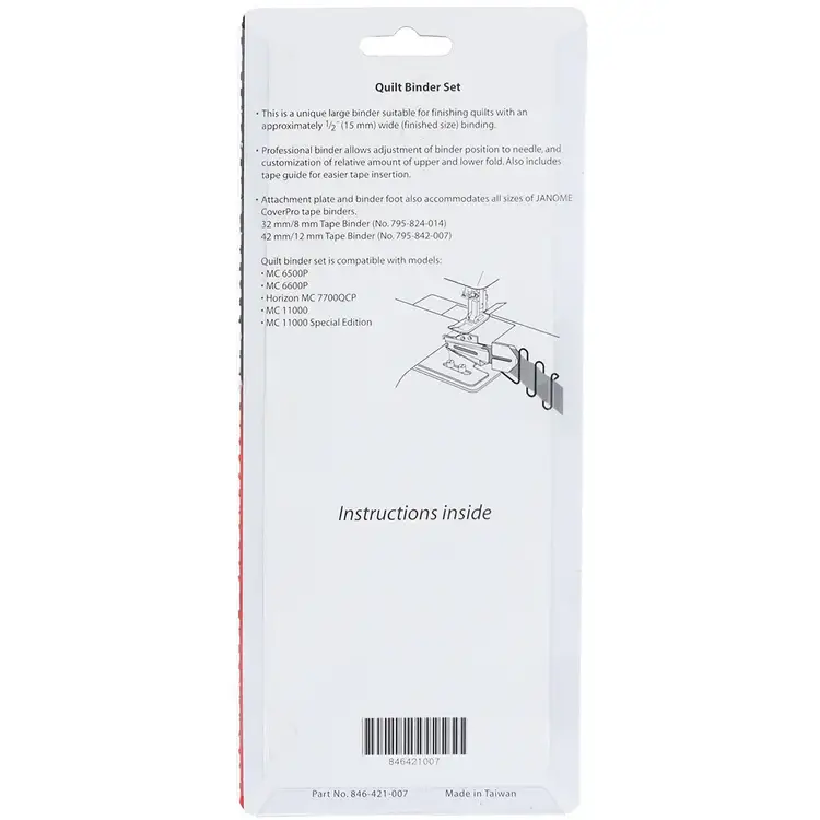 The Janome Quilt Binder Set (High Shank 7mm) makes binding quilts fast and easy with its industrial-style design. The front cone feeds and folds your fabric to create a neat ½” finished binding. You can adjust the upper screws to control the fold—keep them even for a straight stitch or offset them slightly for a blanket stitch. It’s a must-have for clean, professional quilt edges.