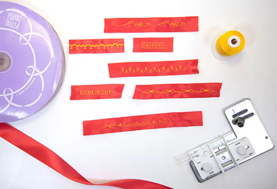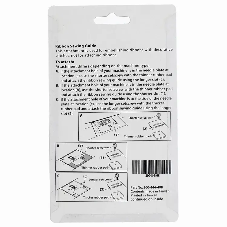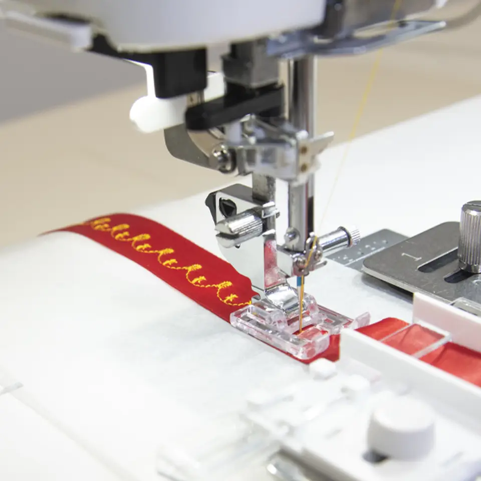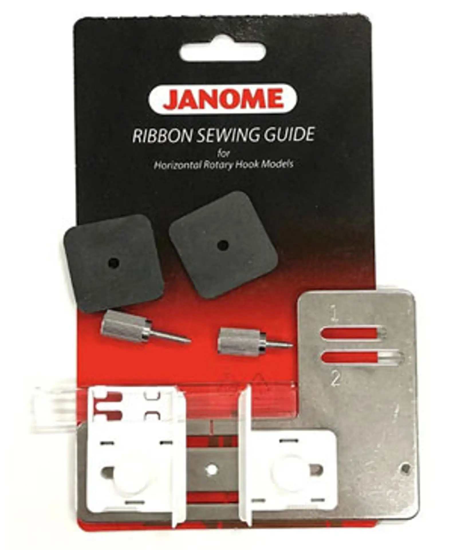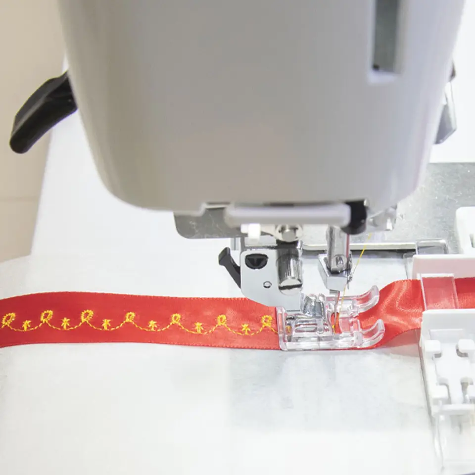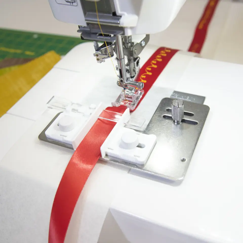 The Janome Ribbon Sewing Guide allows you to create original ribbons by adding decorative stitching or lettering. Its design ensures easy attachment and automatic entry, while the transparent stabilizer bar provides perfect control for precise stitching. This guide helps you add unique, personalized details to your projects, making the most of your machine’s decorative stitches.