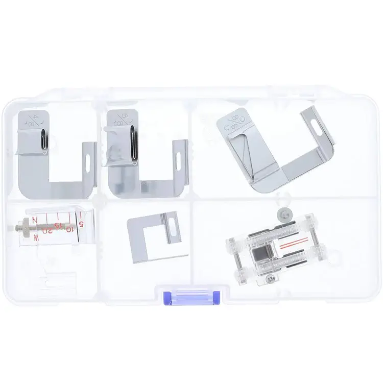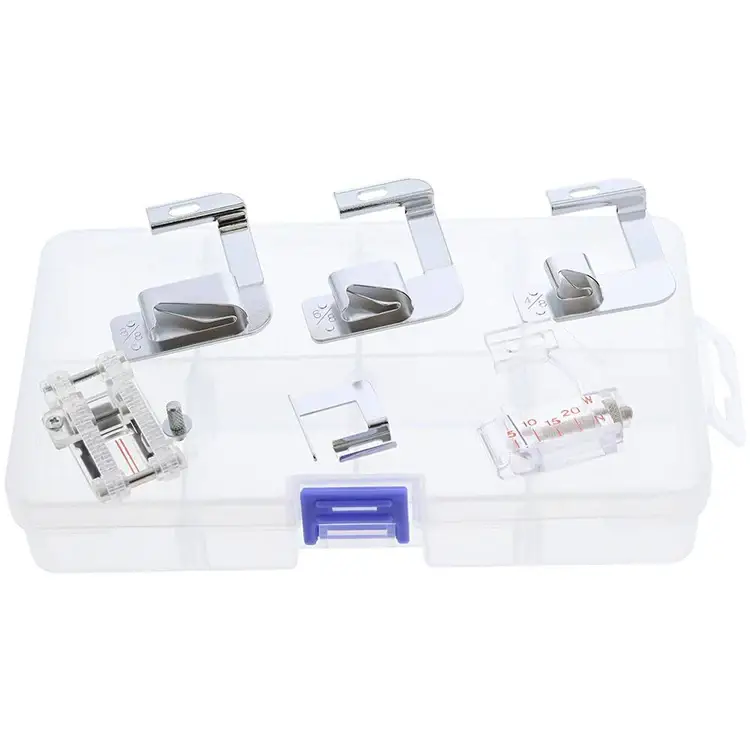 The Janome Rotary Even Foot is designed for use with all sewing machines and is perfect for handling tricky fabrics like stretch knits, jersey, leather, and vinyl. Its rotating rollers and left-right tilt help feed fabrics evenly, even over bulky seams or uneven layers. Ideal for hemming thick fabrics, it comes with handy attachments: a blind hem guide, bias tape guide, and wide rolled hem guide for added versatility.