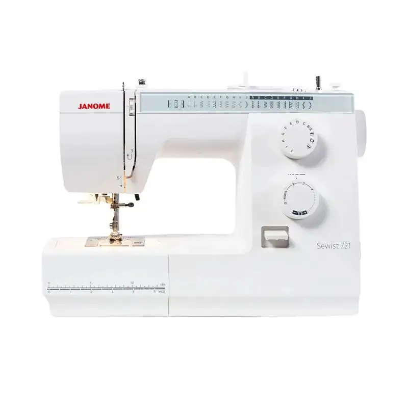 The Janome Sewist 721 Mechanical sewing machine is versatile with 19 built-in stitches, suitable for quilting, apparel, and home decor. It features a free arm, a four-step buttonhole, and a four-piece feed dog system for consistent fabric feeding. It includes four presser feet for different tasks and can sew at speeds up to 830 stitches per minute, making it a dependable choice for a range of sewing projects.