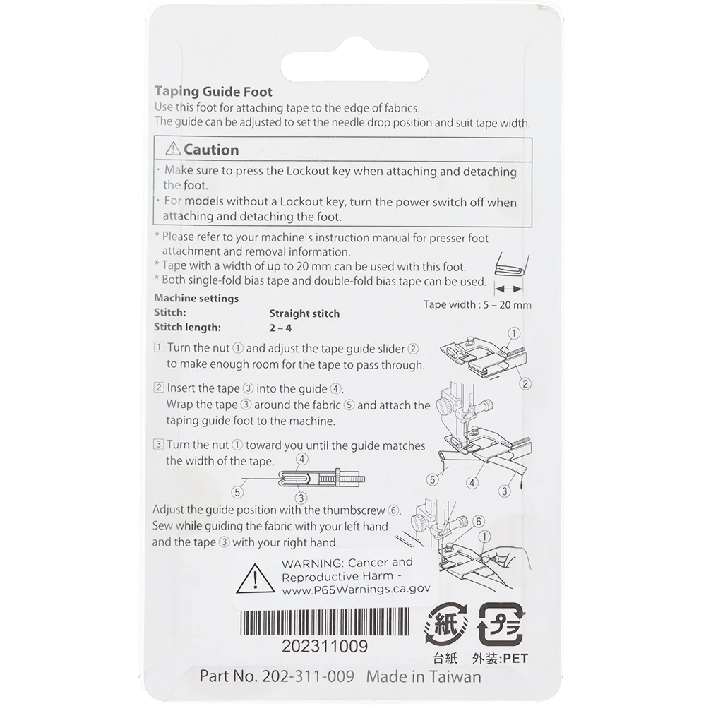 The Janome Taping Guide Foot (5-7mm) makes it easy to attach tape neatly to the edge of your fabric. You can adjust the needle drop position using the thumb screw for perfect placement. Simply guide the fabric with your left hand and feed the tape with your right for smooth, even results.